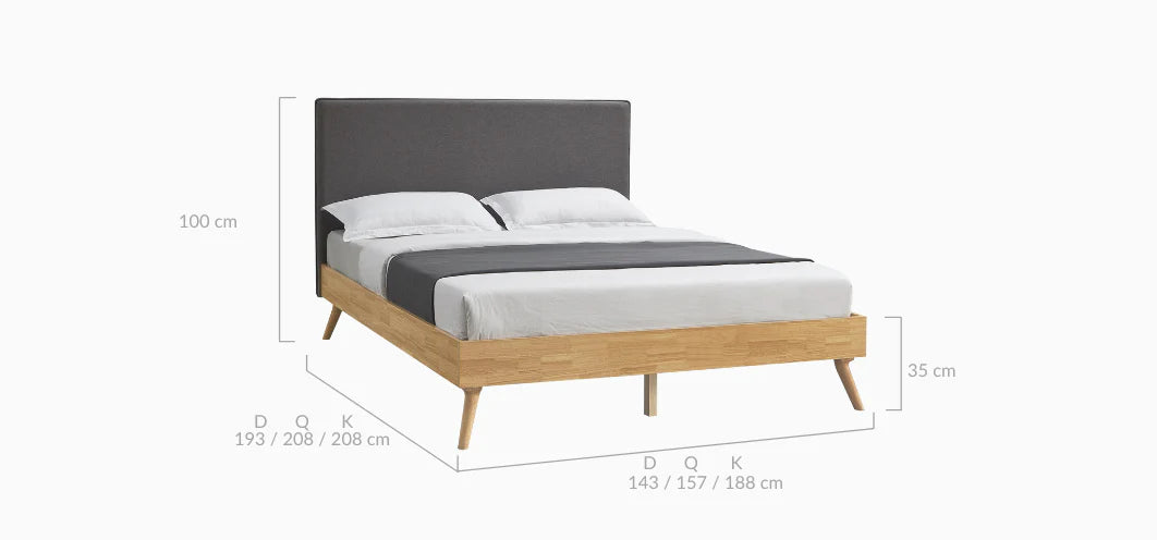 The slightly curved edges of the fabric-clad headboard and tapered scandi-rustic legs of the bed frame delivers an excellent combination of style and trendiness.