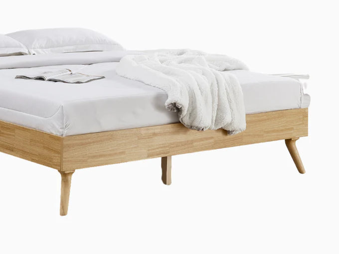 The simple wooden side-rails of this bed base are complemented with tapered solid hardwood legs that invoke the Scandinavian aesthetic in its full glory.