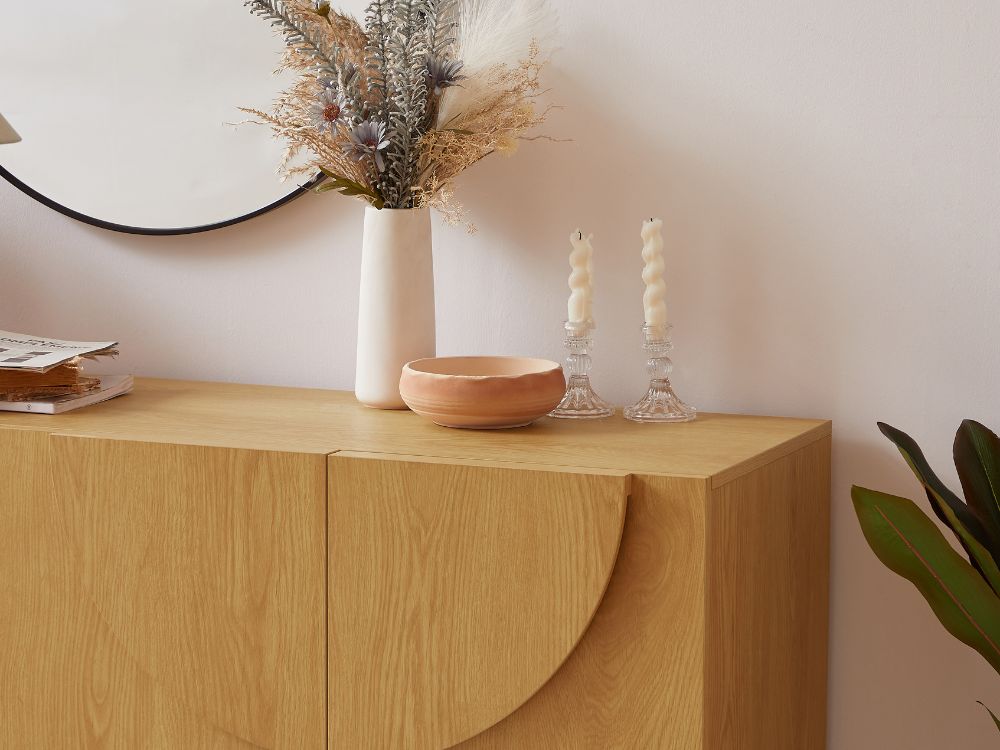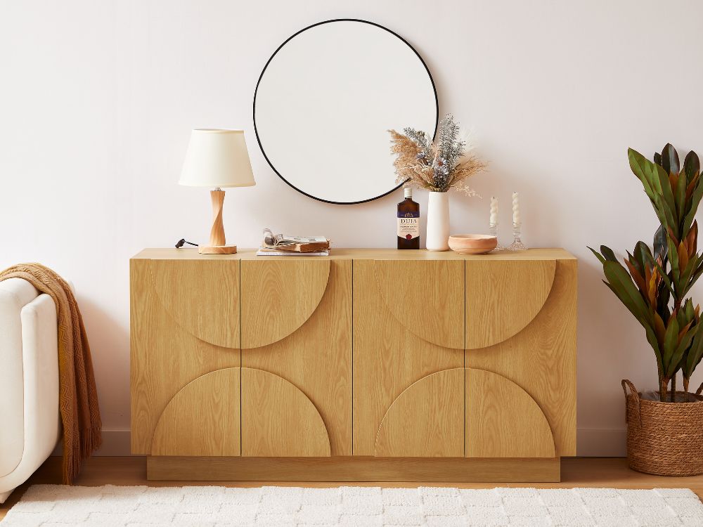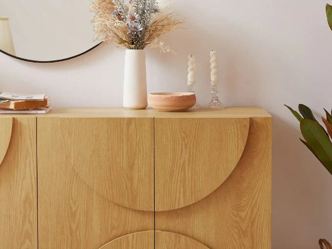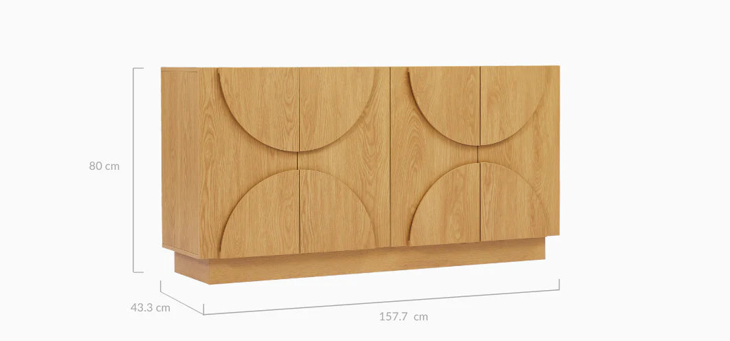 Who said furniture had to be boring? The Cleo Sideboard breaks the mold with its eye-catching half moon shape holder. This distinctive feature adds a playful twist to its design, making it a conversation starter and a focal point of admiration.
