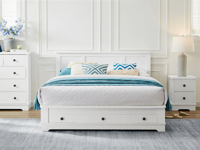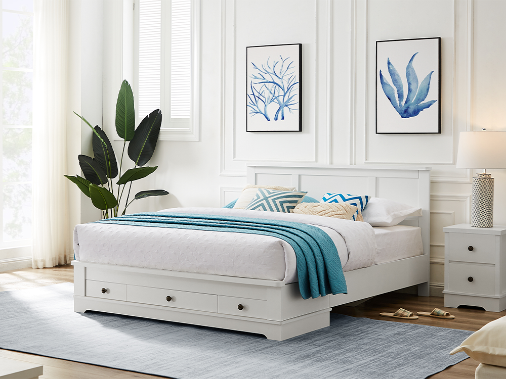The white and neutral tone of this bed frame beautifully captures the simple sophistication of a Hamptons-style home.